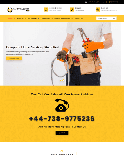 Für das Unternehmen Handy Electric Pro in Großbritannien wurde eine moderne Website erstellt, die verschiedene Elektro- und Handwerksdienstleistungen übersichtlich präsentiert. Die Website enthält ein Buchungsformular und ist vollständig responsiv.