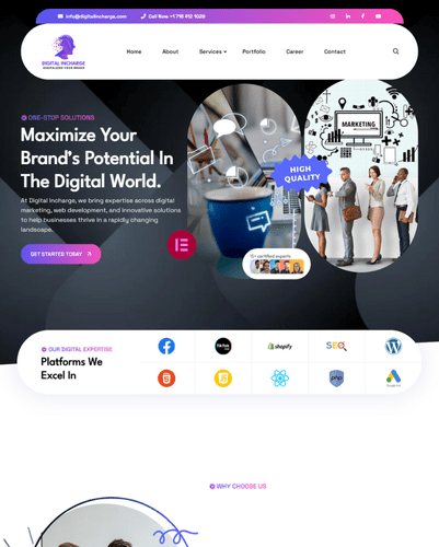 Für die Marketingagentur „Digital in Charge“ entwickelten wir eine professionelle Website, die ihre Dienstleistungen im Bereich digitales Marketing wirkungsvoll darstellt. Das Design vermittelt Vertrauen und Innovationskraft.